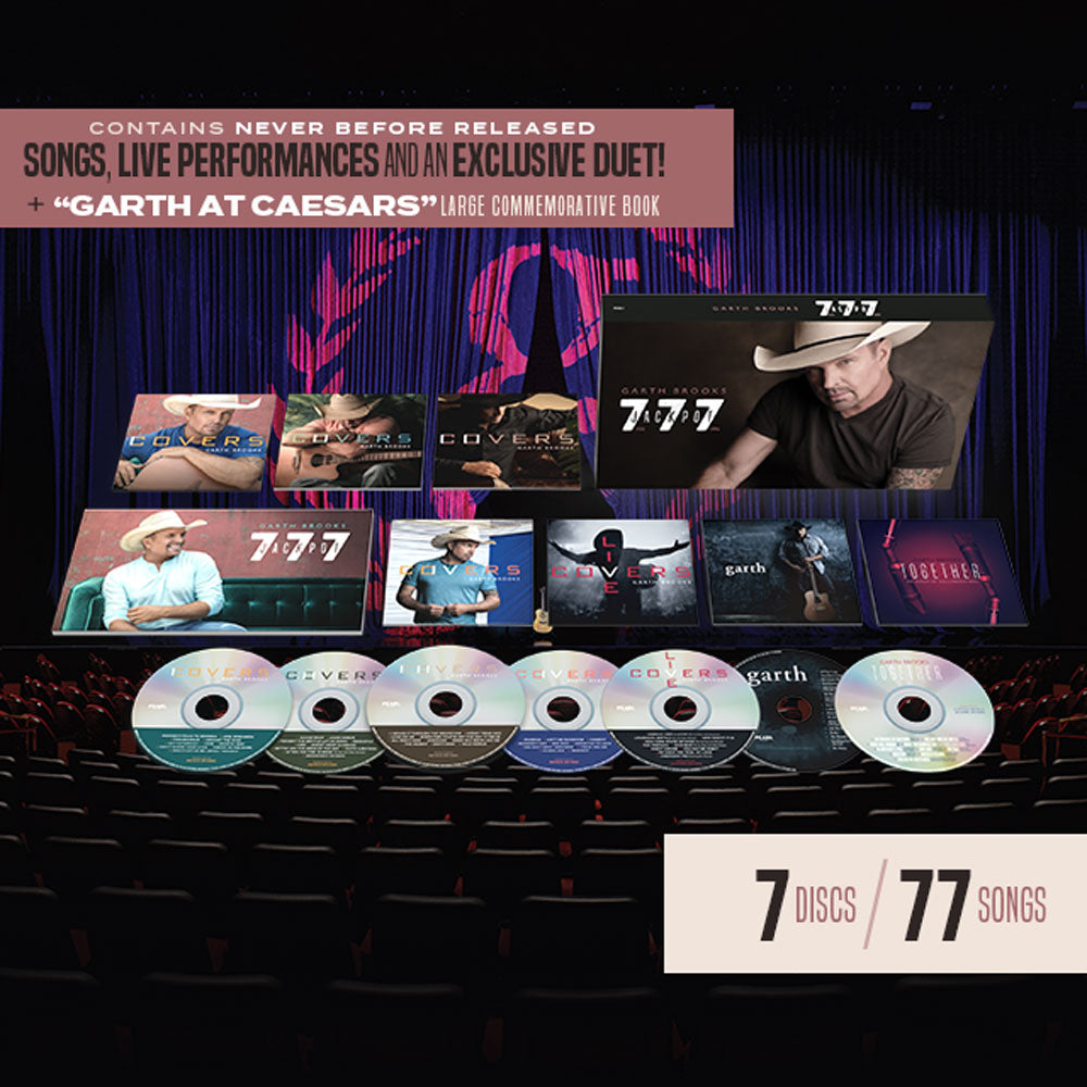 Garth Brooks 777 Jackpot Box Set includes 7-discs, 77 songs and a custom 88-pagebook full of photos commemorating his Las Vegas Residency at The Colosseum at Caesars Palace. This 7-disc set of Garth performing hit influential songs is the PERFECT souvenir and gift. A must have for your collection.